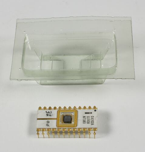 Manufacturer's datasheet for the Intel 4702A EPROM from Google Docs: "The 4702A is a 256 word by 8 bit electrically programmable ROM ideally suited for microcomputer system development where fast turn-around and pattern experimentation are important. The 4702A undergoes complete programming and functional testing on each bit position prior to shipment, thus ensuring 100% programmability. The 4702A is packaged in a 24 pin dual-in-line package with a transparent quartz lid. The transparent quartz lid allows the user to expose the chip to ultraviolet light to erase the bit pattern. A new pattern can then be written into the device. This procedure can be repeated as many times as required. The circuitry of the 4702A is entirely static; no clocks are required...The 1702A is fabricated with silicon gate technology. This low threshold technology allows the design and production of higher performance MOS circuits and provides a higher functional density on a monolithic chip than conventional MOS technologies." [Link 1] - Retrieved 6 Oct 2010 (M.Vaughan)