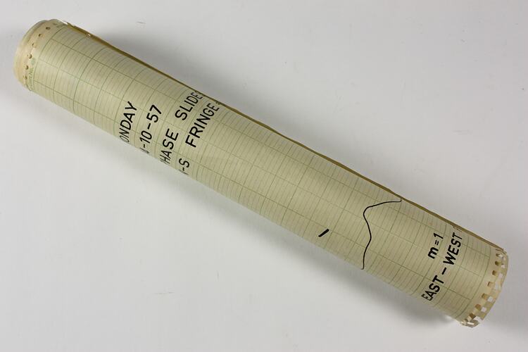 Strip of chart recorder paper (Leeds & Northrup Chart No. 489) with a plot of an astronomical observation dated 14 October 1957, probably related to the Mills Cross radio telescope located at Fleurs field station and operated by the Division of Radiophysics of the Commonwealth Scientific & Industrial Research Organisation (CSIRO), at Badgerys Creek, New South Wales.