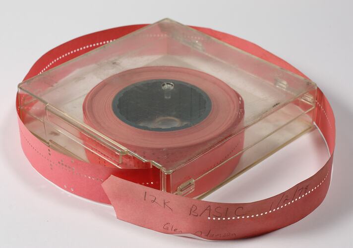 A clear, hinged, plastic box (with a central hole) containing a coil of red paper with holes punched in it. The paper is wound onto a grooved plastic spool. The program name is written on the tape in pencil, along with a date and a name.