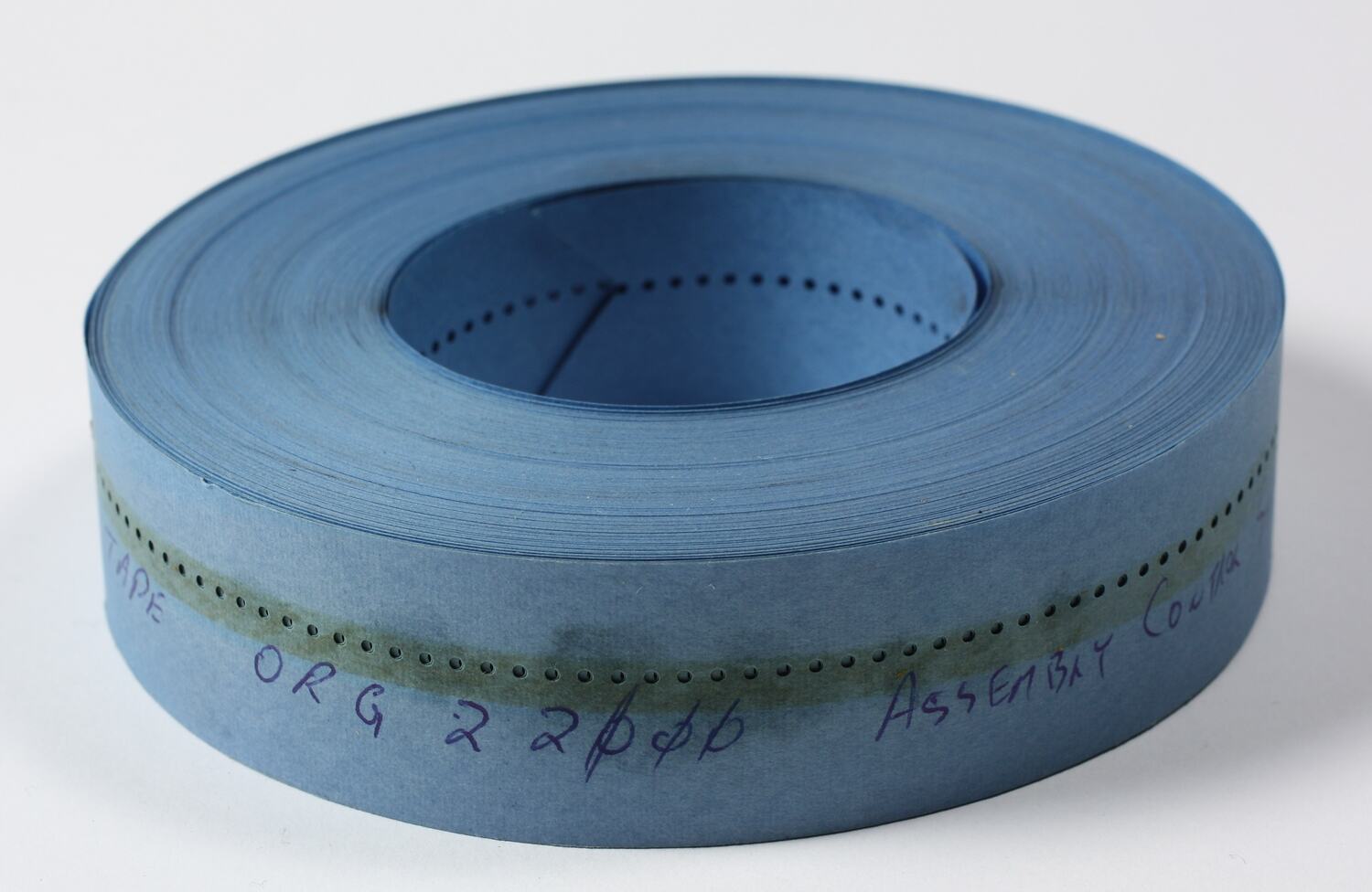 A coil of blue paper with holes punched in it. The name of the program is handwritten on the tape in pen.