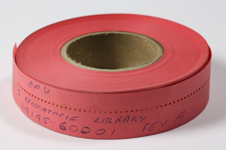 A coil of red paper with holes punched in it, wound on a cardboard spool. The name of the program is handwritten on the tape in pen.