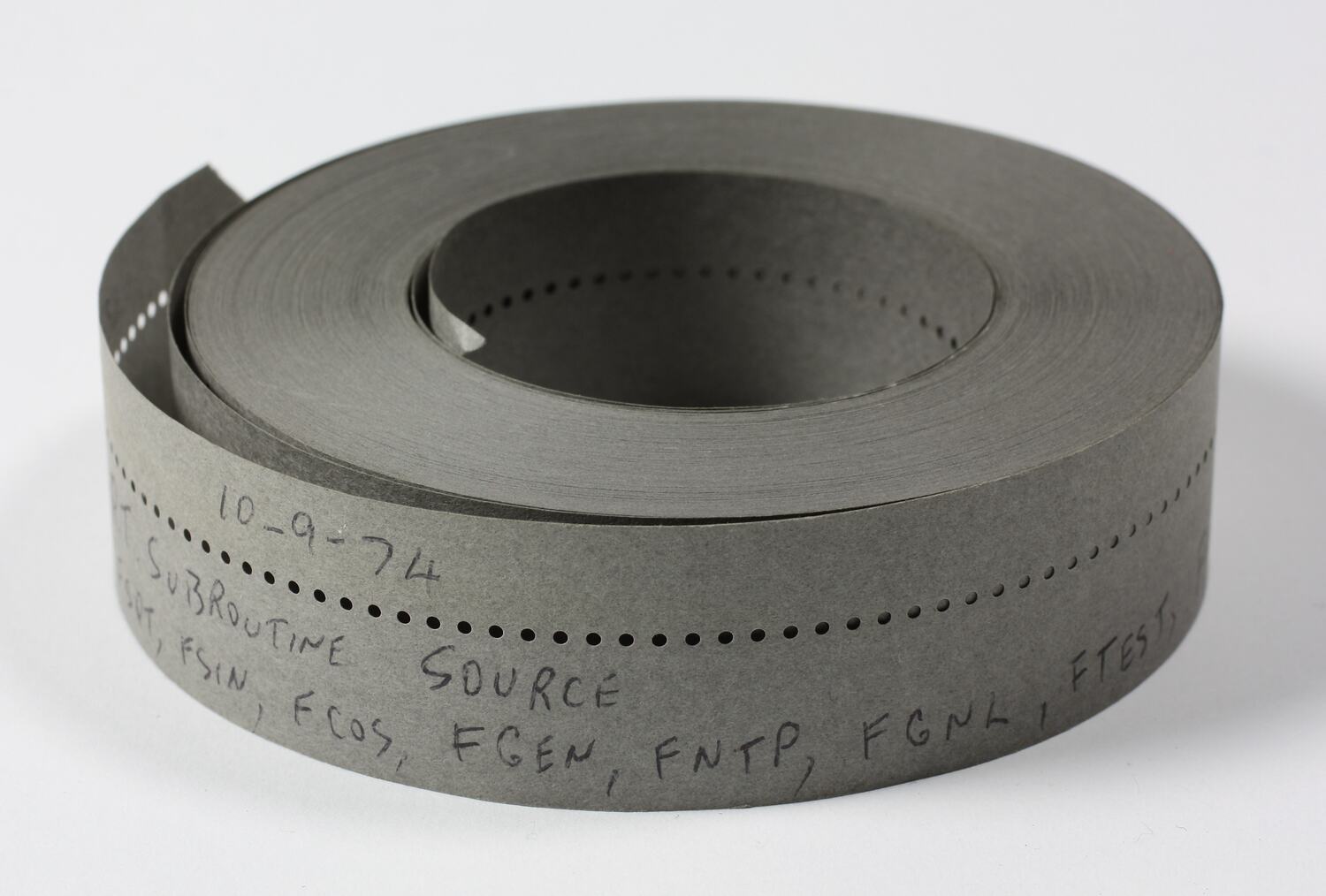 A coil of dark grey paper with holes punched in it. The name of the program and a date is handwritten on the tape in pen.