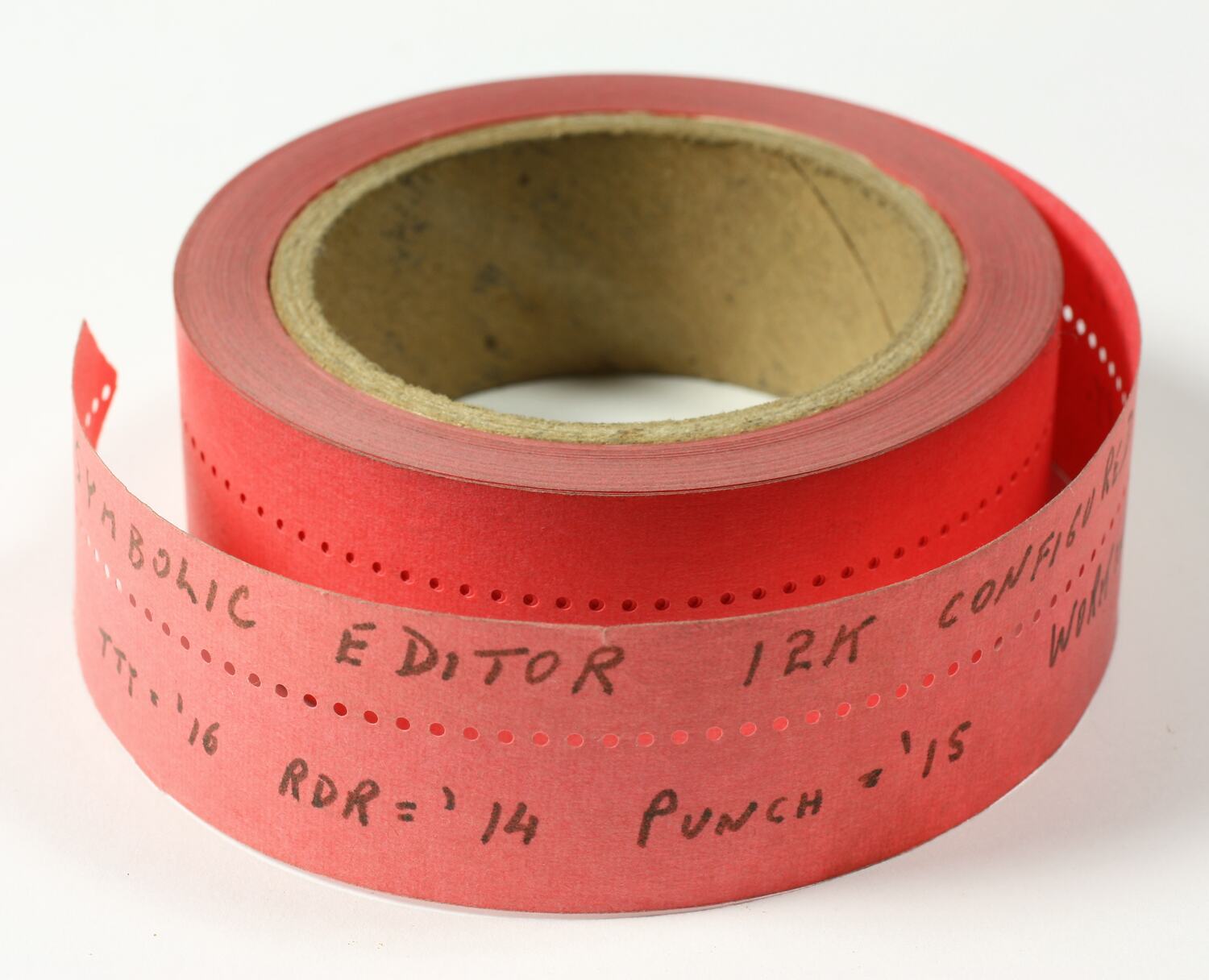 A coil of red paper with holes punched in it, wound on a cardboard spool. The name of the program is handwritten on the tape in pen.