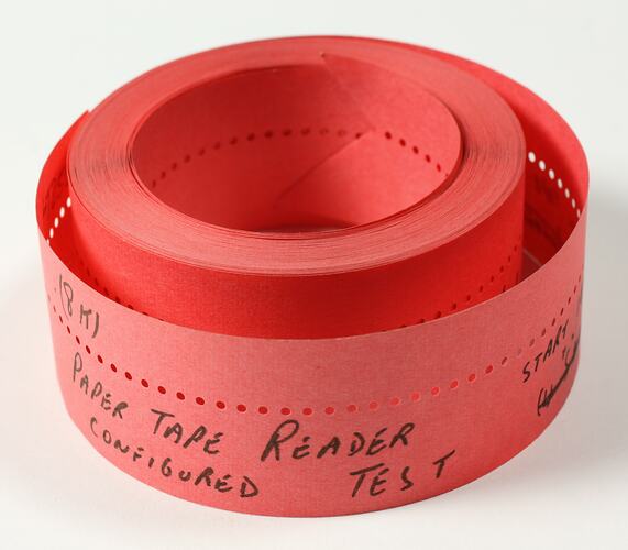 A coil of red paper with holes punched in it. The name of the program and instructions are handwritten on the tape in pen.