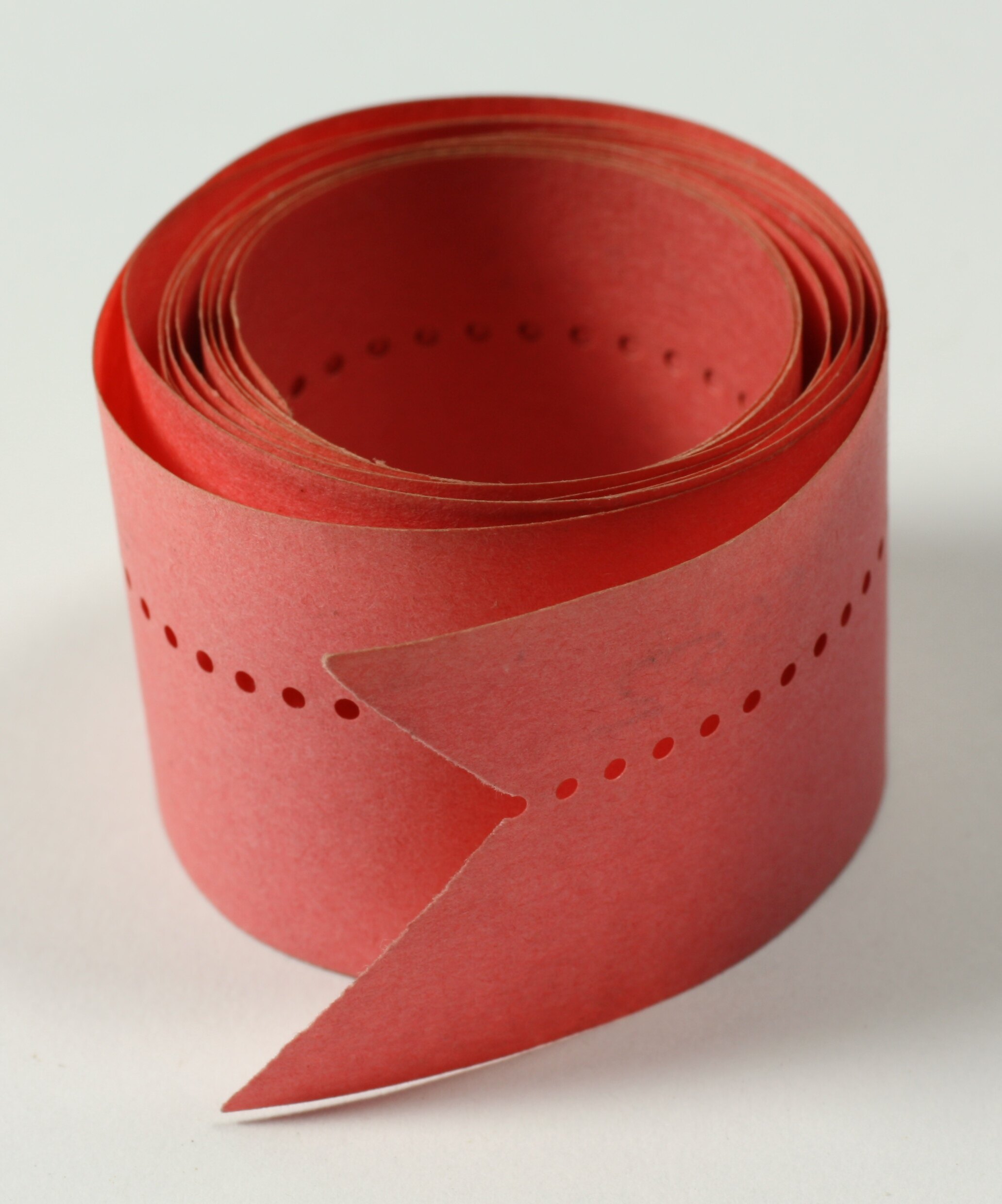 A coil of red paper with holes punched in it.