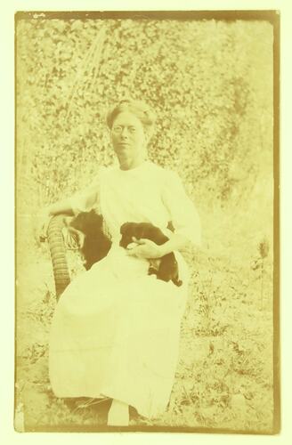 Sepia toned photograph, dating from World War I, of a woman sitting on a cane chair in a garden, holding two black puppies.