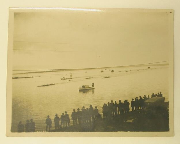 Black and white photograph, dating from World War I, showing a group of men standing on a riverbank watching a rowing race.