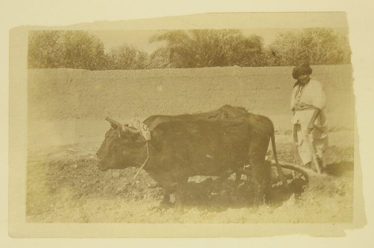 Sepia toned photograph, dating from World War I, of an Islamic man, and two bullocks ploughing a field.