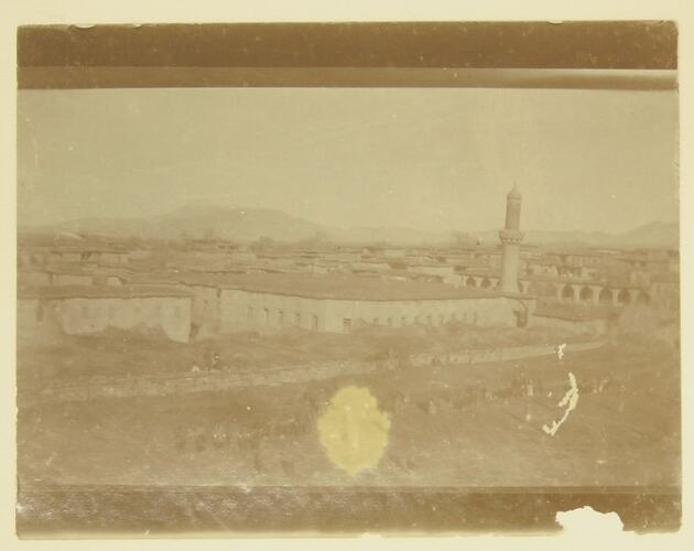 Photograph, dating from World War I, showing a view of a town in the Middle East with low buildings and a minaret visible.