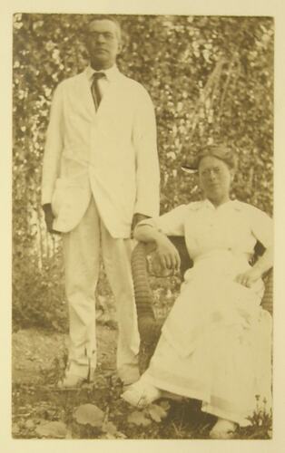 Sepia toned photographic portrait, dating from World War I, of a man, and woman in a garden. The man is standing and the woman is seated.