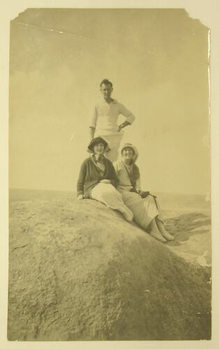 Portrait of a man and two women seated on a rock. The man is standing behind the women, who are seated on the edge of a large rock.