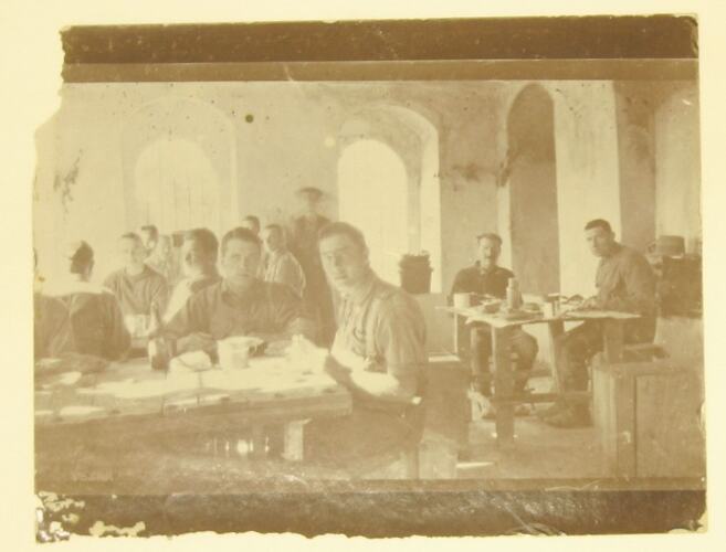 Image of army men eating. View of interior of building with arches throughout. Men seated at wooden tables eating food.