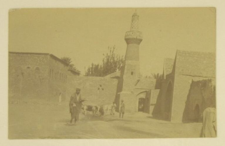 Image of a village in the Middle East. View of a brick tower in the centre, with brick buildings surrounding. Villagers and donkeys are in the foreground.