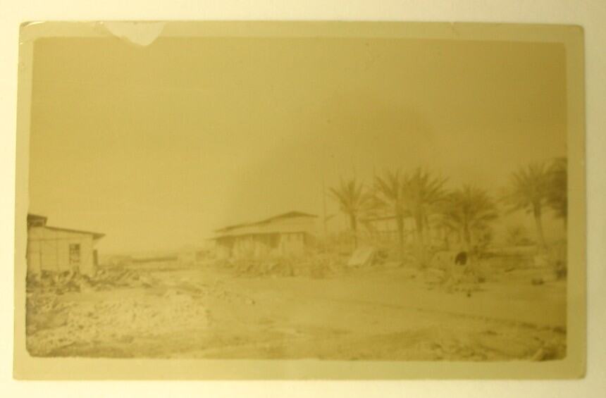 Railway buildings in the Baghdad desert, surrounded by rubble and palm trees.