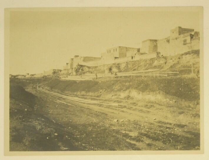 Black and white photograph, dating from World War I, of an empty moat around the town of Mosul, Iraq.