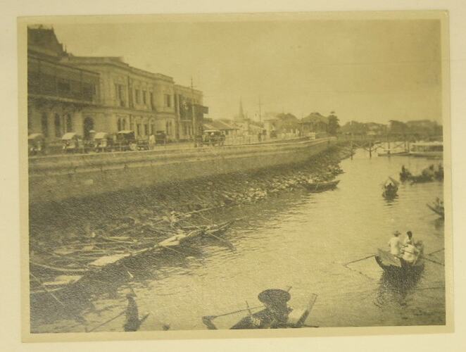 Photograph, dating from World War I, of a river quay in Singapore. There are vehicles on the road running next to the river and people can be seen rowing boats.