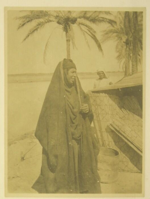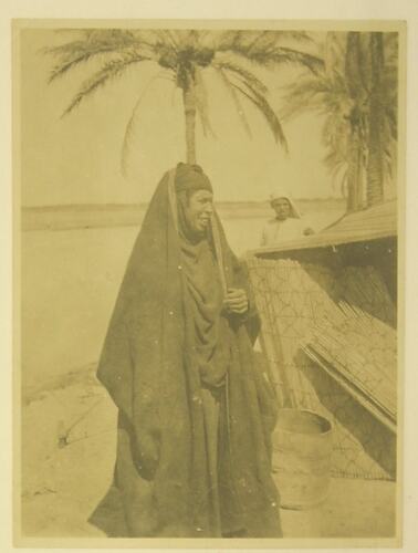 Image of an Arabic woman, dressed in black robes beside a grass hut, with palm trees in the background. A man wearing a turban is standing in the background, dressed in white.