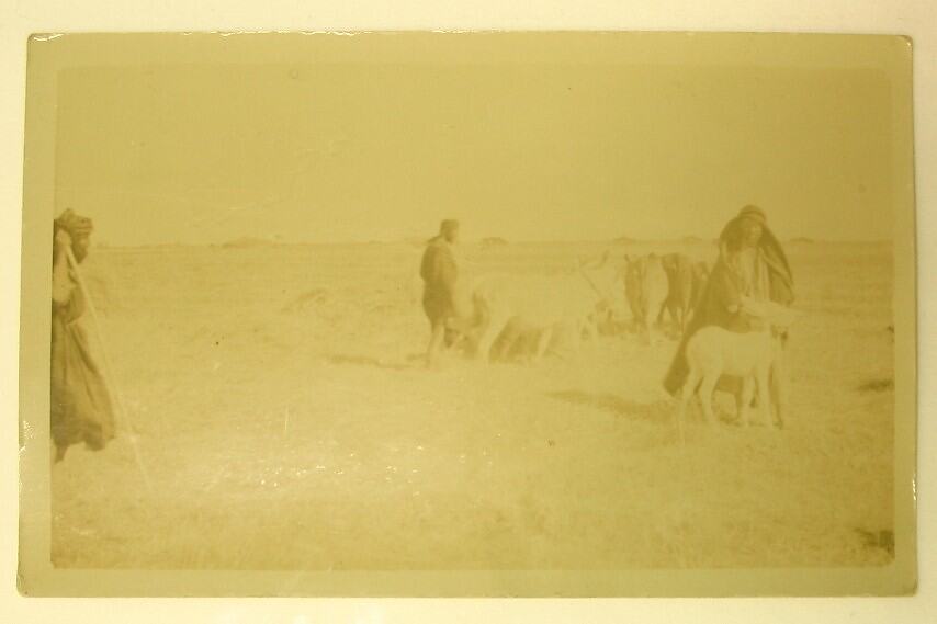 Reverse, handwritten: "This shows the method employed / by the Arabs to thresh the / corn. You can see them / driving the bullocks over a / stack of hay to separate the / grain. What do you think of the / little white Donkey in the front" Reverse, printed: "POST CARD / CARTE POSTALE / Communication - Correspondance / Address - Addresse / STAMP / HERE"
