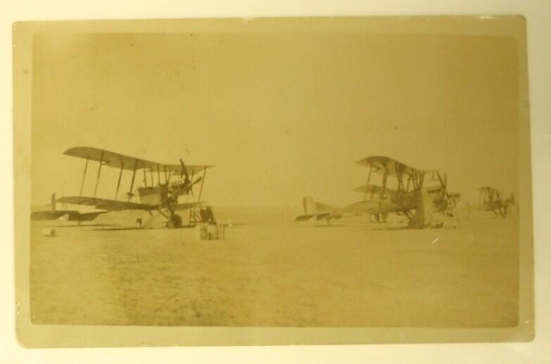 Postcard dating from World War I, showing a black and white photograph of three aeroplanes landed in a field near Baghdad.