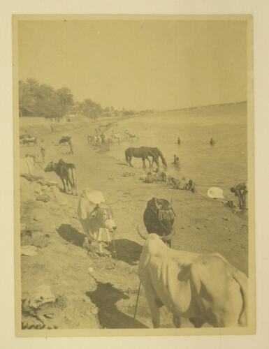 View of the Tigris River in Mosul city, Iraq. Image is of a river with cows and horses walking along the banks, and people bathing in the water.