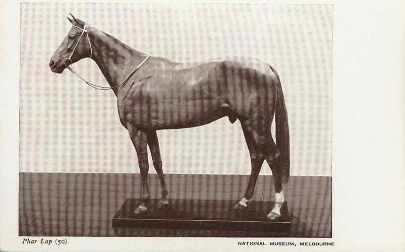 Rectangular postcard with a photographic image of the mount of Phar Lap, with `Phar Lap (50)' and `National Museum, Melbourne' printed on the front.