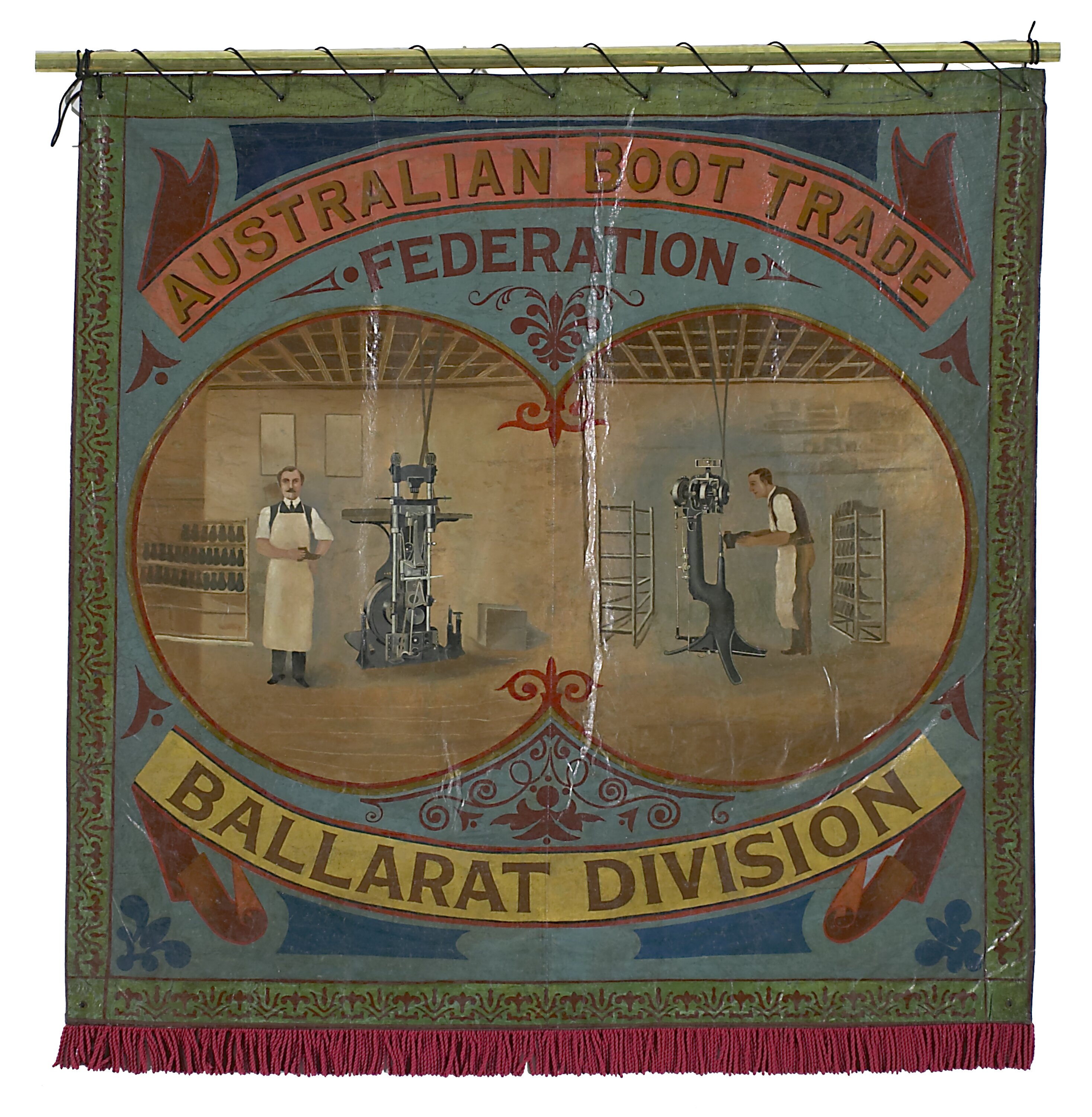 This canvas banner was painted by Fred Spielvogel circa 1905 for the Australian Boot Trade Employees Federation, Ballarat Branch.
