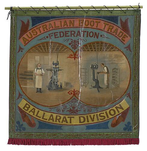 On 5 March 1905 the Ballarat Eight Hours' Day Organising Committee agreed to organise entertainments with a view to raising funds to commission a banner for the Bootmakers' Union (Ballarat Star, 6 March 1905). On 11 April the Ballarat Courier reported on a profoundly rainy Ballarat Eight Hours' Day procession: 'The bootmakers with their new banner looking spic and span it had just emerged from the studio of the artist Mr Fred Spielvogel, and on it were representations of up-to-date boot-producing machinery, came next.'