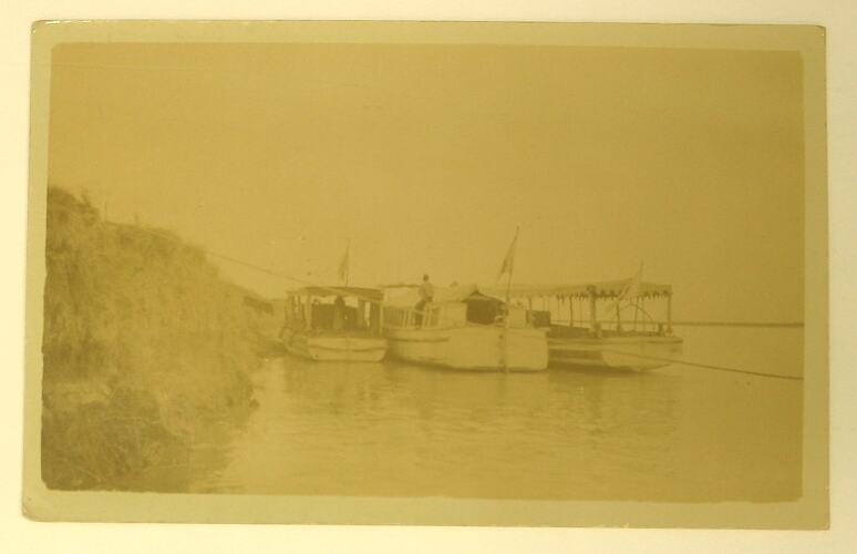 Three Red Cross launches on the Tigris River, moored near the bank. A man is standing on the centre boat.