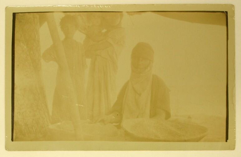 Reverse, handwritten: "Arab woman [Illegible.] / wheat - she has her / hand on the mill - the / wheat can be seen in the / basket" Reverse, printed: "POST CARD / CARTE POSTALE / Communication - Correspondance / Address - Addresse / STAMP / HERE"