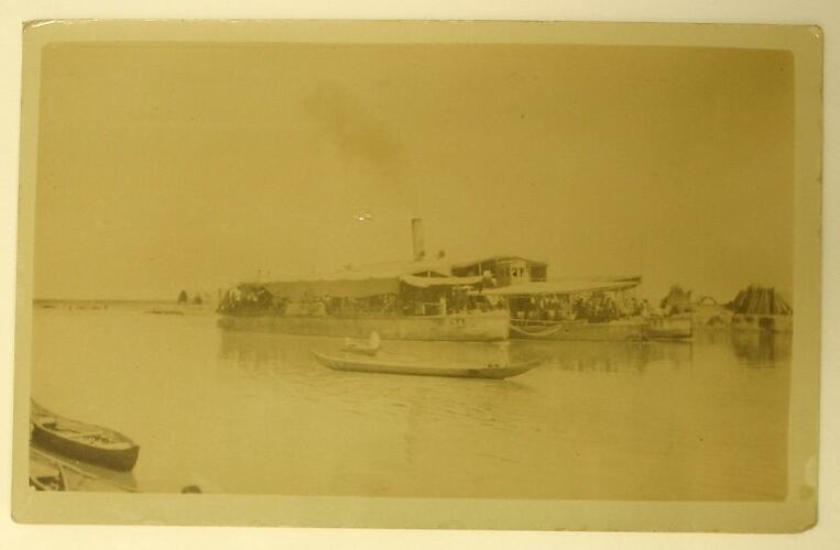 Postcard dating from World War I, showing a black and white photograph of river transport in Iraq for travelling from Basra to Baghdad.