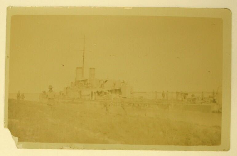 Postcard dating from World War I, showing a black and white photograph of a monitor ship, The Tarantulla (HMS Tarantula), on the Tigris River in the Middle East. The photograph is a duplicate of MM 88670 (and also MM 88801), which is inscribed: 'One of our monitors - The Tarantulla / you have probably seen her mentioned in the papers in connection with her dash up the Tigris & capture of several Turkish river boats. She had just been firing into [Illegible] when I took this. You can see them unfastening the moorings to allow to get away out of range.'