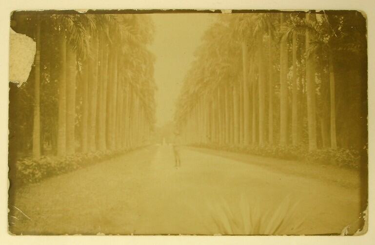 Postcard dating from World War I, showing a black and white photograph of the palm grove in the Botanical Gardens, Calcutta.