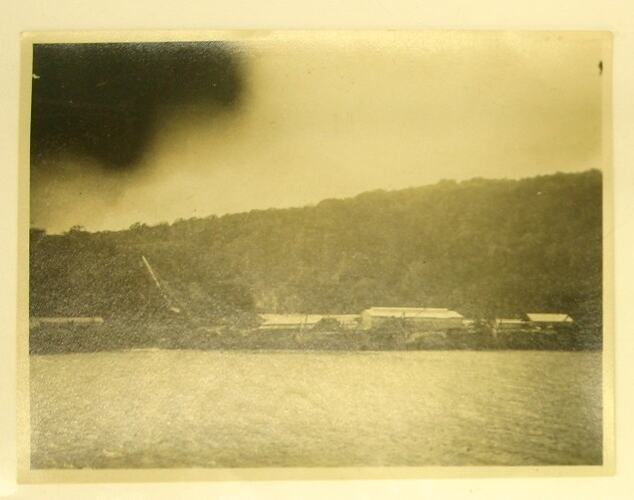 Photograph, dating from World War I, of phosphate mines at Christmas Island, seen from across the water.