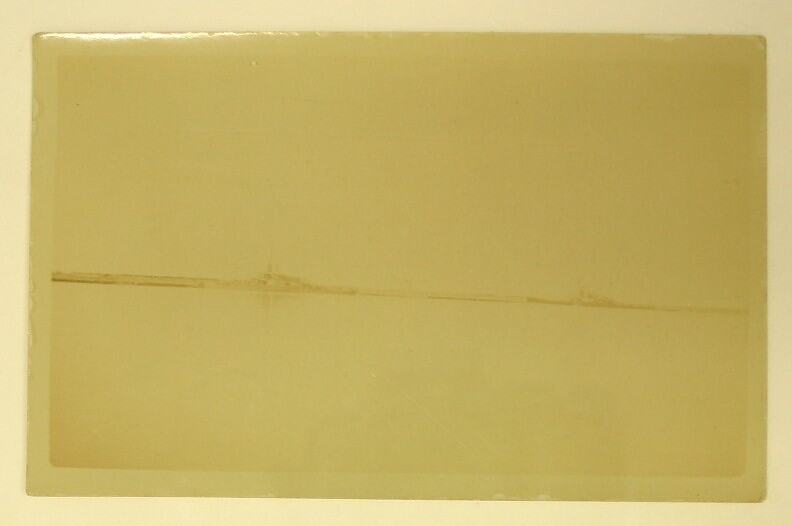 Post card featuring a black and white photograph with an inscription handwritten in pencil on the reverse, describing the scene. The photograph has faded and the card is curled.