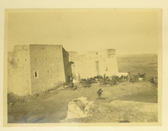 Photograph of the monastry "Illias" via Mosul, Iraq. View is of the exterior walls of the monastry, and surrounding countryside. Men on horses are gathered outside the walls.