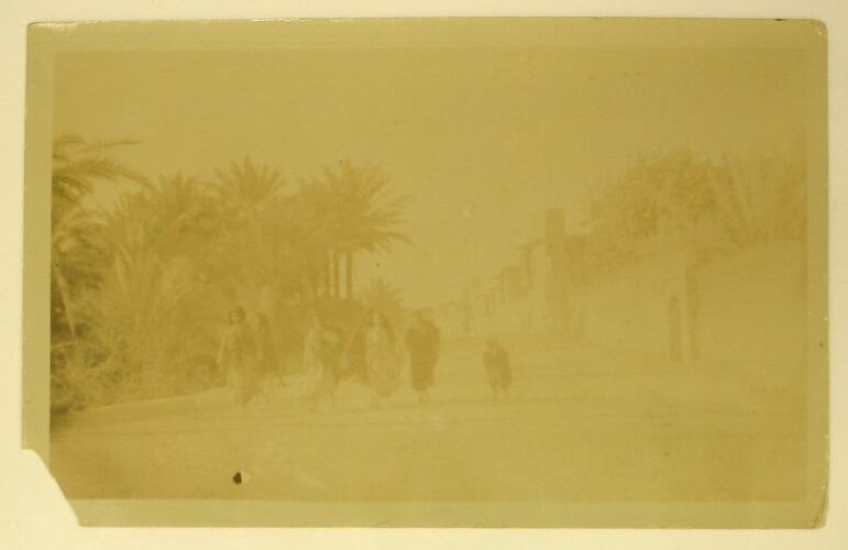 Street scene in Baquba, Iraq. A group of six Iraqis are walking down the road toward the camera. Behind are clusters of palm trees and low stone buildings.