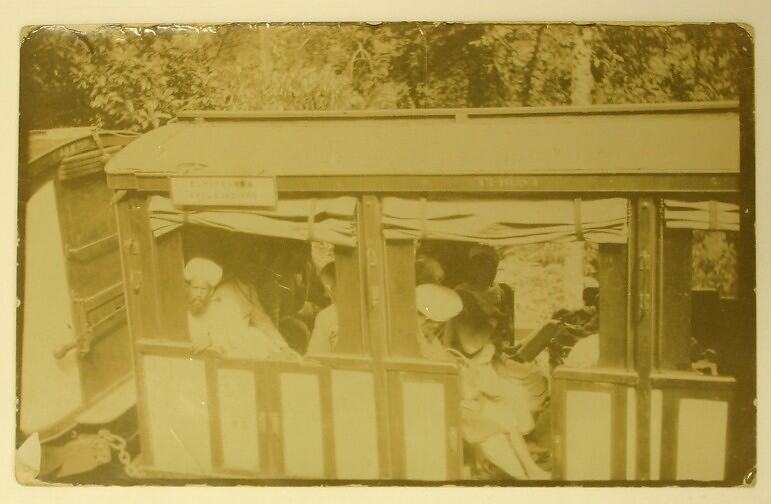 Postcard dating from World War I, showing a black and white photograph of a train carriage occupied by Indians on the Darjeeling Line.