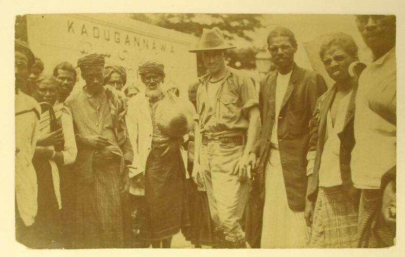 Black and white photograph, dating from World War I, showing an Australian soldier standing with Sri Lankan men and women in Kadugannawa. Most likely taken during leave from 17 June - 2 September 1917 (as per service records) as 1916 stop in Colombo was too short to allow for the journey to Kadugannawa