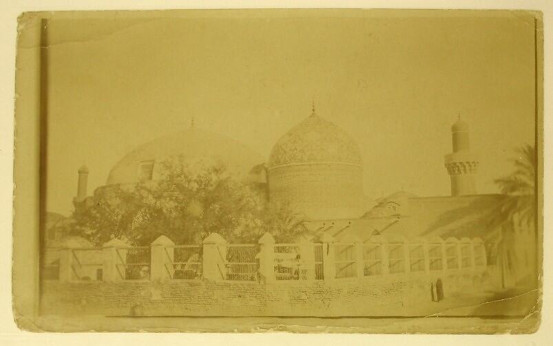 Black and white photograph, dating from World War I, showing the mosque of Abdul Kadir Jelani in Baghdad.