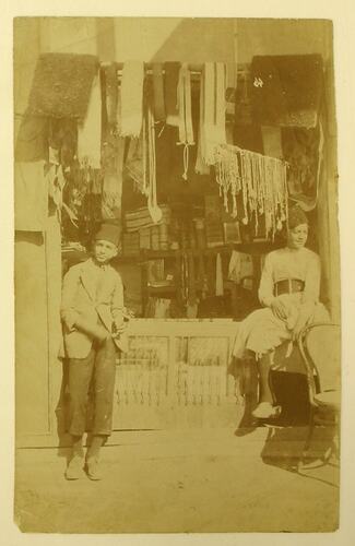 Black and white photograph, dating from World War I, showing a shopfront in Baghdad and two young men, one standing, the other sitting on a ledge.