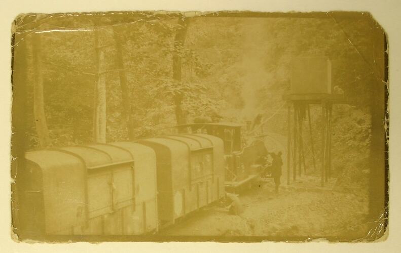 Black and white photograph, dating from World War I, of the Darjeeling train in a forest. Most likely taken when on leave in India in 1917, given the long journey required to get to Darjeeling from the nearest port.