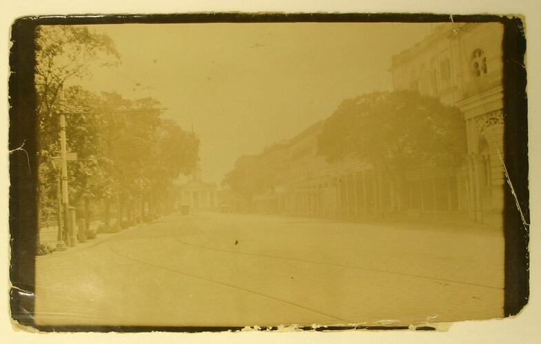 Black and white photograph, dating from World War I, of Old Court House Street in Calcutta.
