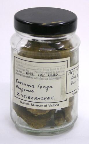 Glass jar, cylindrical in shape, sealed with a black plastic screw lid. Contains hard, dried lumps of tumeric, orange-brown in colour. Two Science Museum of Victoria labels are adhered to the outside of the jar, on which the specimen and collection names are handwritten in black ink.