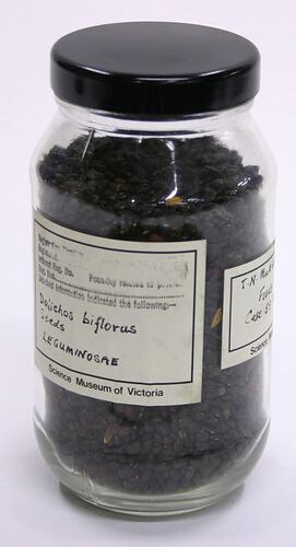 Glass jar, cylindrical in shape, sealed with a black plastic screw lid. Contains numerous dried, round dark brown seeds. Two Science Museum of Victoria labels are adhered to the outside, on which the specimen and collection names are handwritten in black ink.