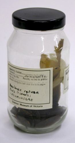 Glass jar, cylindrical in shape, sealed with a black plastic screw lid. Contains three light brown pods and numerous dark brown, flat seeds. Two Science Museum of Victoria labels are adhered to the outside, on which the specimen and collection names are handwritten in black ink.