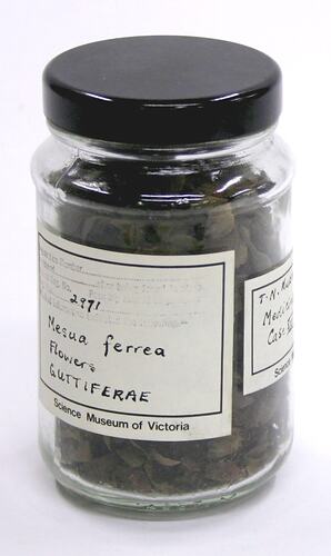 Glass jar, cylindrical in shape, sealed with a black plastic screw lid. Contains dried flowers that are brown with pink tinges in colour. Two Science Museum of Victoria labels are adhered to the outside, on which the specimen and collection names are handwritten in black ink.