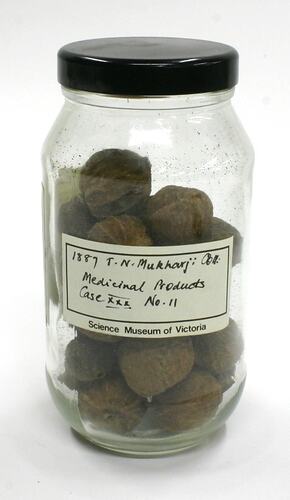 Cylindrical glass jar containing large, round, dark brown dried fruits with rough surfaces, and sealed with a black plastic lid. Two printed white Science Museum of Victoria labels, with handwritten inscriptions in black ink, are adhered to the outside.