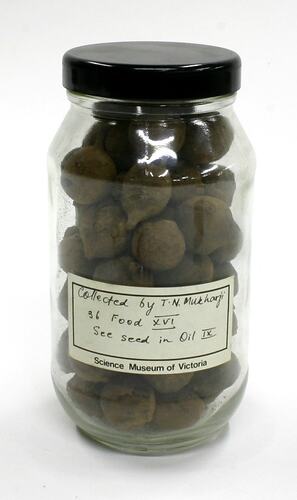 Cylindrical glass jar containing large, round, dark brown dried fruits, and sealed with a black plastic lid. Two printed white Science Museum of Victoria labels, with handwritten inscriptions in black ink, are adhered to the outside.