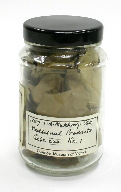Label, handwritten: "1887 Mukharji Coll. / Medicinal Products / Case XXX No. 1" Label, handwritten: "LEAVES OF / PTEROSPERMUM / ACERIFOLIUM / STERCULIACEAE / WILLD"
