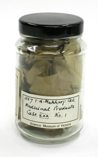 Cylindrical glass jar containing dried, pale olive-green leaves and sealed with a black plastic lid. Two printed white Science Museum of Victoria labels, with handwritten inscriptions in black ink, are adhered to the outside.